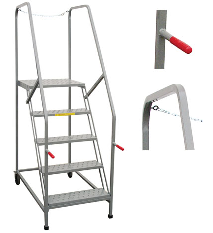 The mobile maintenance platform is a strong tilt and roll style ladder. The top railing is fortified to allow a removable safety chain for workers to climb to other areas. These were originally intended for accessing the backs of freight trucks, but our customers have found a plethora of uses.