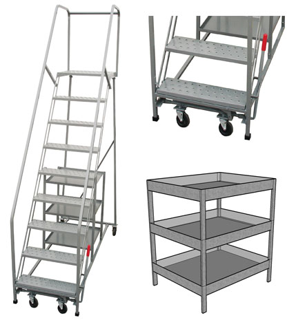 The rolling stock picker ladder offers all of safety and efficiency of our standard rolling ladder, but has the added benefit of a shelving unit within the frame. This ladder is perfect for stock rooms and areas with storage. Reduce the time it takes to move your ladder and boxes by moving them all at once.